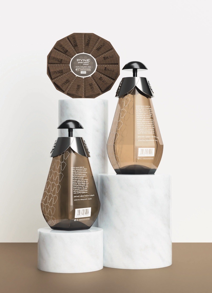 我的概念是從創(chuàng)建一個(gè)品牌開始的。我知道我會(huì)參考松果的設(shè)計(jì),所以我希望整個(gè)品牌都與松樹有關(guān)。在我的仿生書中,用審美選擇暗示主題是可以的,只要它是為了建立品牌的背景,并且一切都與作為最終產(chǎn)品呈現(xiàn)的具有凝聚力的故事的消費(fèi)者相關(guān)。我為PYNE洗手液產(chǎn)品線提供的三種變體制作了三種香水配置文件。三者都以松樹作為共同的音符,創(chuàng)造了一致的嗅覺品牌標(biāo)識(shí)。派恩洗手液是原版的主要變體;它有一個(gè)標(biāo)志性的,泥土的,平衡的特點(diǎn)與廣藿香,松子,檀香木的額外注意。原作是一款即時(shí)經(jīng)典,給人一種優(yōu)雅的感覺。這些品質(zhì)也體現(xiàn)在包裝設(shè)計(jì)中:在長(zhǎng)方形瓶身上有一個(gè)柔和的調(diào)色板,帶有米色和深綠色。派恩洗手液antibac有一個(gè)泡沫,脆,明亮的個(gè)性與杜松漿果,羅勒,和帕洛桑托作為補(bǔ)充說明??箟难嶙兎N讓人想起在溫暖的夏天喝杜松子酒補(bǔ)品,因?yàn)樗鼘⑿l(wèi)生與新鮮聯(lián)系在一起。瓶子的設(shè)計(jì)是球狀的,主要是白色,帶有藍(lán)色和綠色的色調(diào),窗戶可以窺視里面的洗手液。另一方面,PYNE hand Wash Intensive限量版則與之完全相反,添加了香料、甘草和苦杏仁,創(chuàng)造了一種美食家、深度和奢華的體驗(yàn)。這就像你夢(mèng)寐以求的水療之旅,裝在一個(gè)瓶子里,它有著多面的寶石般的形狀,由琥珀色的玻璃和白色印刷的圖形元素組成。