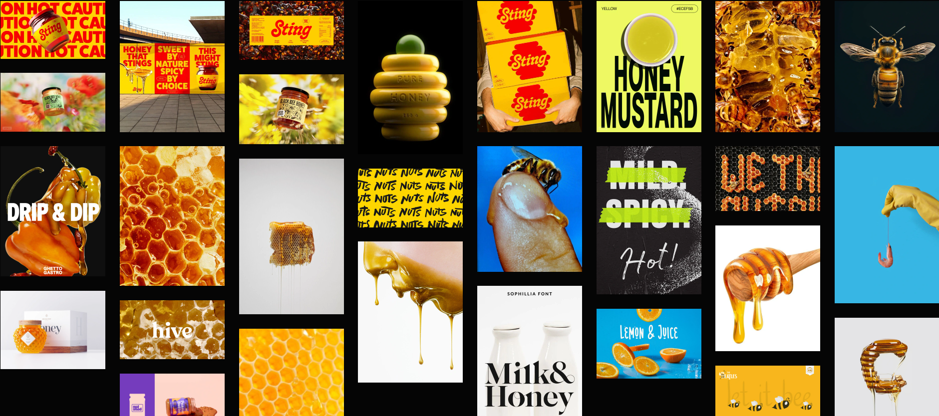 Sting - Hot Honey,需要一個大膽而大膽的品牌標(biāo)識,既甜又辣。這個概念指導(dǎo)了設(shè)計,利用動態(tài)但簡單的黃色和紅色調(diào)色板來代表口味的融合。字體選擇反映了這種對比,將厚重、自信的顯示字體與柔和、精致的襯線搭配在一起。圓潤形狀和代表熱度的銳利棱角線條之間取得了平衡。俏皮俏皮的文案警告顧客該產(chǎn)品的辣味,同時誘使他們將 Sting 添加到他們最喜歡的菜肴中。從養(yǎng)蜂業(yè)中汲取靈感,非常憤怒的蜜蜂表示“蜂巢很熱”,我們傾向于這一概念,創(chuàng)造出大膽、大膽的語言來強化 Sting 的火熱個性——提醒顧客這種蜂蜜不僅甜,而且有刺痛感。