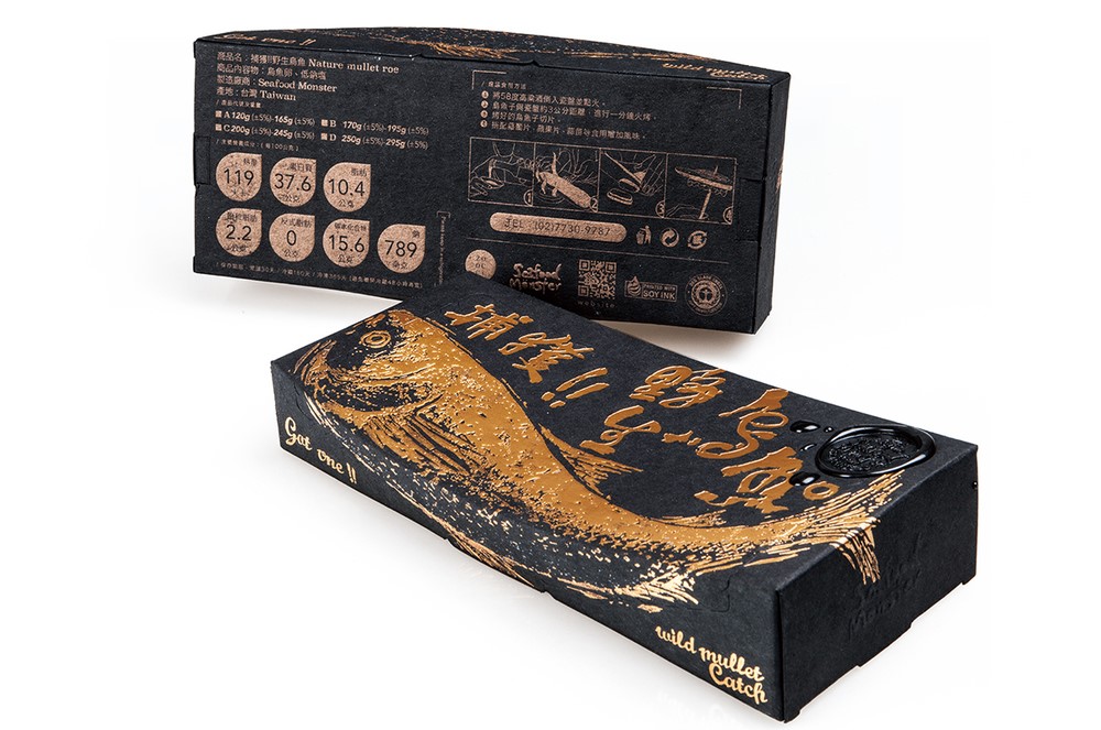 野生烏魚因其黑色背面而得名,因為臺灣的“吳”一詞有“黑”的意思。在冬季,每年都是野生烏魚的季節(jié),沿海的漁村被鋪上曬干的烏魚魚子的金色光芒所覆蓋。這就是為什么烏魚魚兒也被稱為海中的黑色黃金的原因。這意味著它對臺灣和中國大陸的烏魚產(chǎn)業(yè)所具有的經(jīng)濟地位?!俺尸F(xiàn)的一種烏金的視覺,劉經(jīng)緯以魚拓藝術(shù)形式將產(chǎn)烏魚的形體,在視覺上非常的突出。他這套包裝讓臺灣文化與民眾生活躍上國際視線。曾獲得2015的紅點獎。